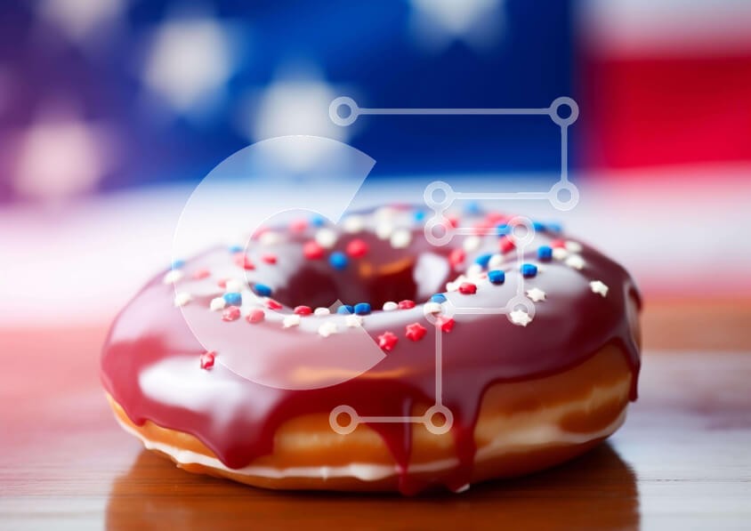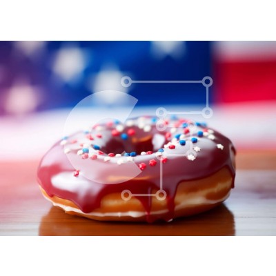 Υπάρχει δυνατότητα προσωποποίησης με δική σας φωτογραφία και προσαρμογής διαστάσεων κατόπιν παραγγελίας. Το συγεκεριμενο puzzle παρουσιαζει Η εικόνα απεικονίζει ένα πατριωτικό ντόνατ διακοσμημένο με κόκκινο, λευκό και μπλε γλάσο και ψεκασμούς. Τοποθετείται σε ένα ξύλινο τραπέζι σε σχήμα αμερικανικής σημαίας σε πρώτο πλάνο, δημιουργώντας ένα εορταστικό και εορταστικό σκηνικό. Ένα μοναδικό puzzle που συνδυάζει ποιό