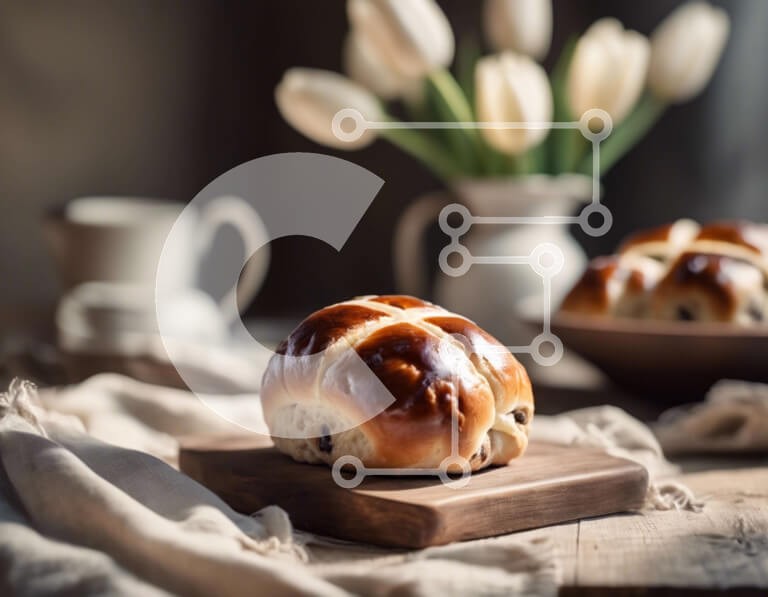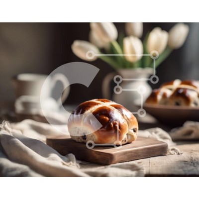 Υπάρχει δυνατότητα προσωποποίησης με δική σας φωτογραφία και προσαρμογής διαστάσεων κατόπιν παραγγελίας. Το συγεκεριμενο puzzle παρουσιαζει Αυτή η εικόνα παρουσιάζει μια ξύλινη σανίδα κοπής με δύο ζεστά σταυρωτά ψωμάκια, πολλές τουλίπες στο βάθος και ένα φλιτζάνι που θα μπορούσε να χρησιμοποιηθεί για το σερβίρισμα του τσαγιού ή του καφέ. Η συνολική σκηνή αποπνέει ζεστασιά και μια αίσθηση εορτασμού του Πάσχα, σηματ
