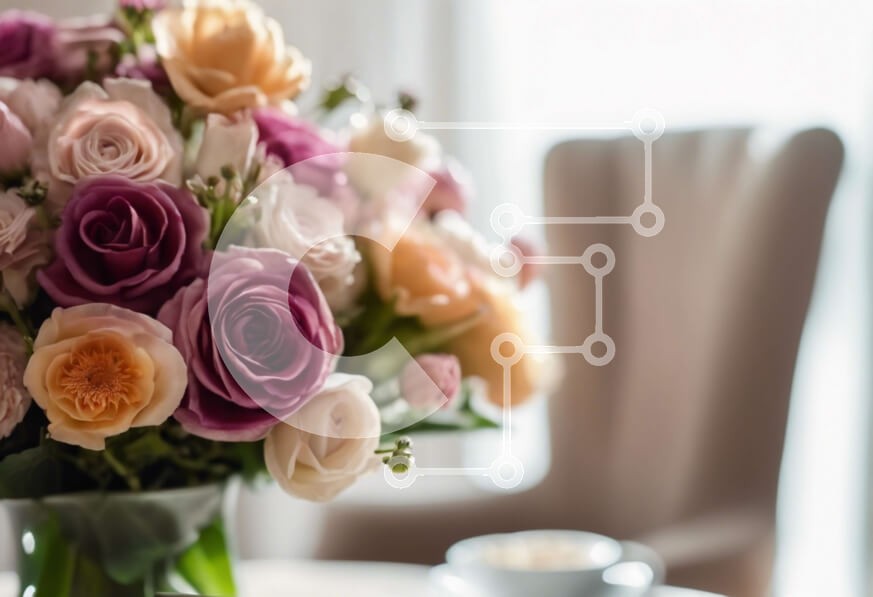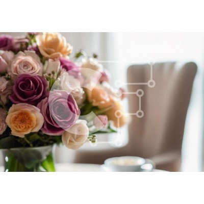 Υπάρχει δυνατότητα προσωποποίησης με δική σας φωτογραφία και προσαρμογής διαστάσεων κατόπιν παραγγελίας. Το συγεκεριμενο puzzle παρουσιαζει Η εικόνα παρουσιάζει ένα βάζο γεμάτο με ροζ, μοβ και κίτρινα τριαντάφυλλα. Υπάρχουν επίσης πολλά φλιτζάνια καφέ στο τραπέζι, τα οποία θα μπορούσαν να χρησιμοποιηθούν για την προετοιμασία τσαγιού ή καφέ. Μια καρέκλα υπάρχει επίσης στην εικόνα, υποδηλώνοντας ότι μπορεί να είναι