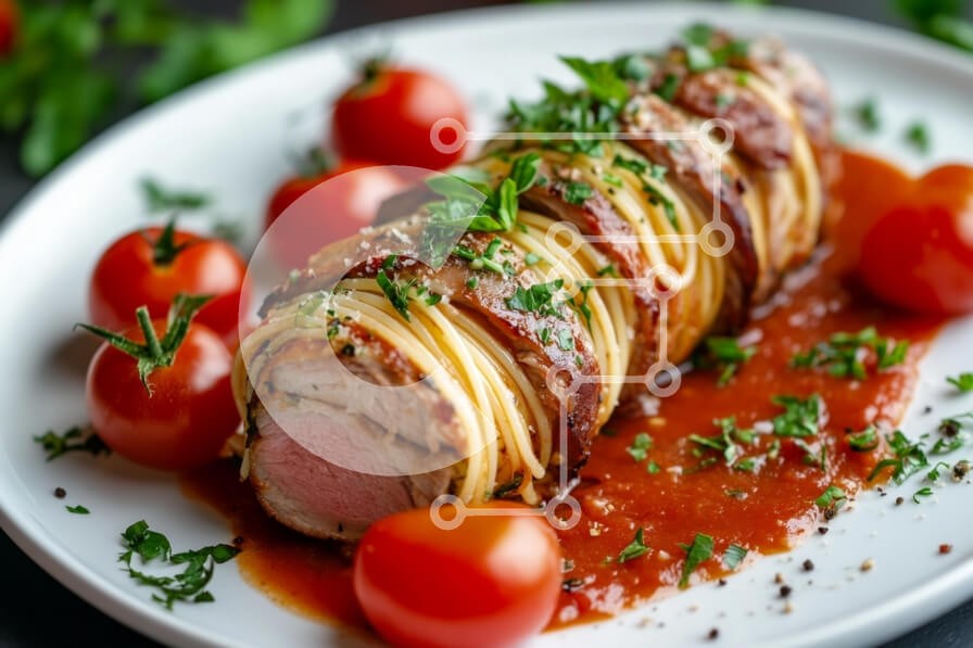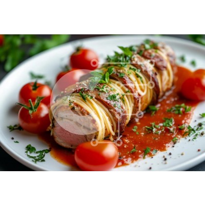 Υπάρχει δυνατότητα προσωποποίησης με δική σας φωτογραφία και προσαρμογής διαστάσεων κατόπιν παραγγελίας. Το συγεκεριμενο puzzle παρουσιαζει Αυτή η εικόνα παρουσιάζει ένα όμορφα παρουσιασμένο πιάτο που περιλαμβάνει ένα ρολό κρέας τυλιγμένο σε μακαρόνια και από πάνω βότανα. Το πιάτο γαρνίρεται με φρέσκο μαϊντανό και συνοδεύεται από ώριμα ντοματίνια, όλα σε ένα πιάτο με μια πλούσια σάλτσα ντομάτας από κάτω. Τα χρώμ