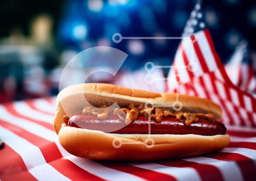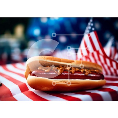 Υπάρχει δυνατότητα προσωποποίησης με δική σας φωτογραφία και προσαρμογής διαστάσεων κατόπιν παραγγελίας. Το συγεκεριμενο puzzle παρουσιαζει Αυτή η εικόνα παρουσιάζει ένα νόστιμο χοτ-ντογκ με κέτσαπ και μουστάρδα, τοποθετημένο πάνω από ένα τραπεζομάντιλο με σχέδιο αμερικανικής σημαίας. Το κουλούρι είναι διακοσμημένο με διάφορες επικαλύψεις, συμπεριλαμβανομένων των απολαύσεων και των τουρσιών, δημιουργώντας ένα υπέρ
