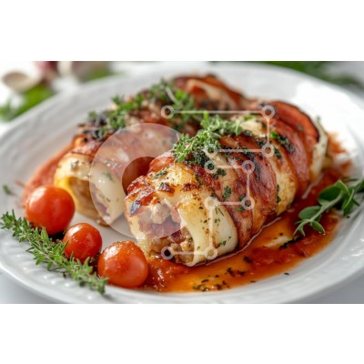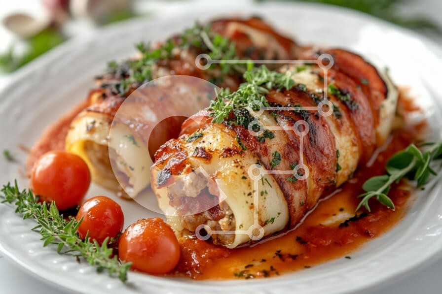 Υπάρχει δυνατότητα προσωποποίησης με δική σας φωτογραφία και προσαρμογής διαστάσεων κατόπιν παραγγελίας. Το συγεκεριμενο puzzle παρουσιαζει Αυτή η εικόνα παρουσιάζει δύο υπέροχα παρασκευασμένα πιάτα σε ρολό, τυλιγμένα σε τραγανό μπέικον, που στηρίζονται σε ένα λευκό πιάτο. Τα ρολά γαρνίρονται με φρέσκα μυρωδικά, συμπεριλαμβανομένου του θυμαριού, και συνοδεύονται από ζωηρά ντοματίνια. Μια πλούσια σάλτσα ντομάτας πε