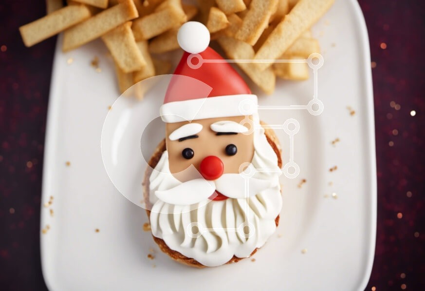 Υπάρχει δυνατότητα προσωποποίησης με δική σας φωτογραφία και προσαρμογής διαστάσεων κατόπιν παραγγελίας. Το συγεκεριμενο puzzle παρουσιαζει Αυτή η εικόνα δείχνει ένα επιδόρπιο σε σχήμα Άγιου Βασίλη που τοποθετείται πάνω από τηγανητές πατάτες. Το επιδόρπιο είναι διακοσμημένο με κόκκινο και λευκό γλάσο για να θυμίζει το πρόσωπο του Άγιου Βασίλη, ενώ οι πατάτες προσθέτουν ένα αλμυρό στοιχείο στο πιάτο. Τα γύρω κομμάτ