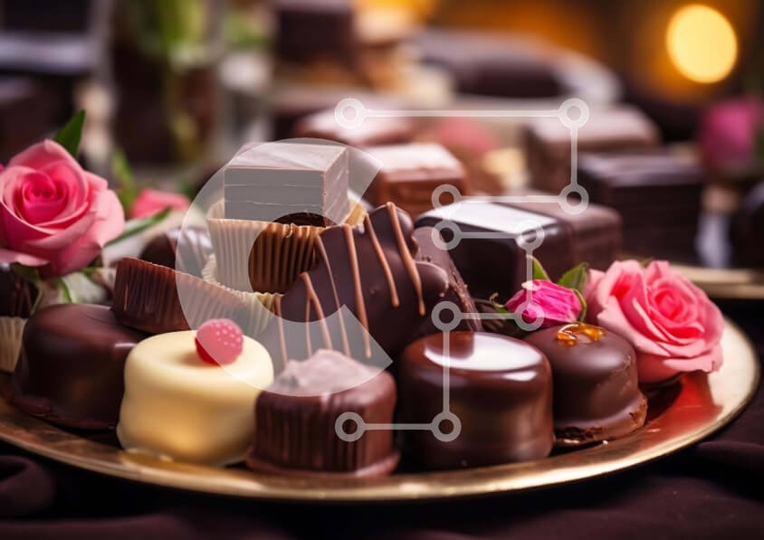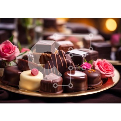 Υπάρχει δυνατότητα προσωποποίησης με δική σας φωτογραφία και προσαρμογής διαστάσεων κατόπιν παραγγελίας. Το συγεκεριμενο puzzle παρουσιαζει Η εικόνα δείχνει μια χρυσή πλάκα γεμάτη με μια ποικιλία από σοκολάτες και λουλούδια. Εμφανίζονται διάφορα είδη σοκολάτας, όπως μπάρες μαύρης σοκολάτας, τετράγωνα λευκής σοκολάτας και τρούφες σοκολάτας γάλακτος. Οι σοκολάτες κυμαίνονται από φρεσκοφτιαγμένες έως ελαφρώς παλαιωμέ