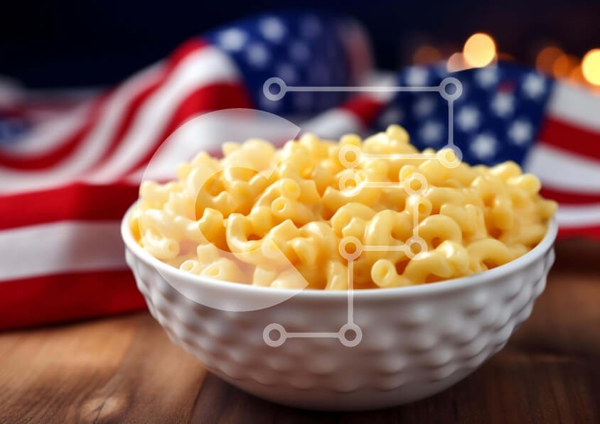 Υπάρχει δυνατότητα προσωποποίησης με δική σας φωτογραφία και προσαρμογής διαστάσεων κατόπιν παραγγελίας. Το συγεκεριμενο puzzle παρουσιαζει Αυτή η εικόνα δείχνει ένα λευκό μπολ γεμάτο με μακαρόνια και τυρί τοποθετημένο πάνω από μια αμερικανική σημαία. Το έντονο κίτρινο χρώμα και το χαρακτηριστικό σχήμα των ζυμαρικών είναι ευδιάκριτα. Πολλές κόκκινες, λευκές και μπλε σημαίες διακρίνονται στο βάθος, υποδηλώνοντας έν