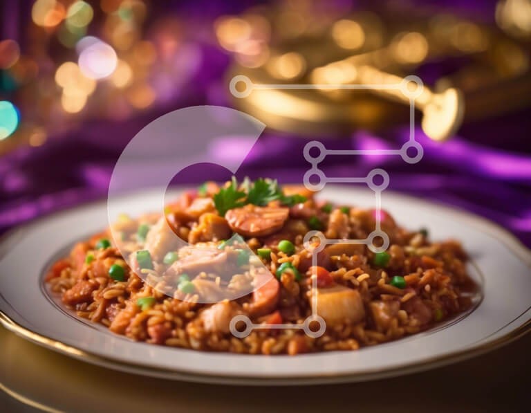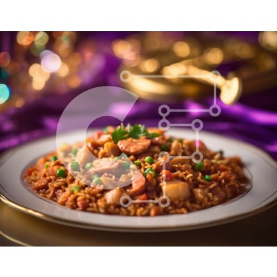 Υπάρχει δυνατότητα προσωποποίησης με δική σας φωτογραφία και προσαρμογής διαστάσεων κατόπιν παραγγελίας. Το συγεκεριμενο puzzle παρουσιαζει Αυτή η εικόνα δείχνει ένα πιάτο με ρύζι με λουκάνικο, μπιζέλια και πιπεριές. Το κομψό μωβ τραπεζομάντιλο προσθέτει μια πινελιά κομψότητας στη σκηνή. Πολλά κομμάτια από ασημικά είναι ορατά, υποδηλώνοντας ότι το γεύμα έχει σερβιριστεί και απολαύσει. Ένα μοναδικό puzzle που συνδ