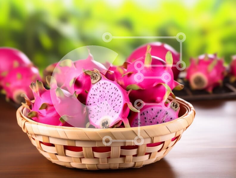 Υπάρχει δυνατότητα προσωποποίησης με δική σας φωτογραφία και προσαρμογής διαστάσεων κατόπιν παραγγελίας. Το συγεκεριμενο puzzle παρουσιαζει Αυτή η εικόνα παρουσιάζει μια ζωντανή ποικιλία από φρούτα δράκου που εμφανίζονται σε ένα υφαντό καλάθι. Οι καρποί είναι εντυπωσιακοί με τη λαμπερή ροζ φλούδα τους και τη μοναδική φολιδωτή όψη, μερικοί είναι ολόκληροι ενώ ο ένας είναι κομμένος στη μέση, αποκαλύπτοντας τη λευκή