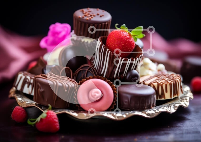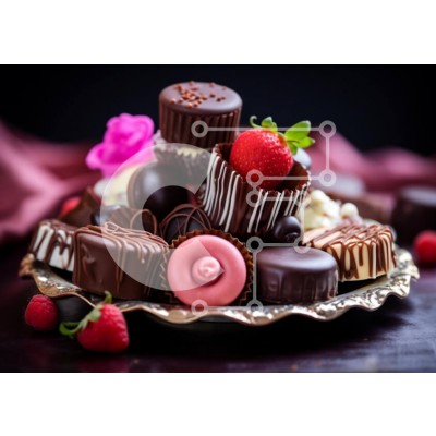 Υπάρχει δυνατότητα προσωποποίησης με δική σας φωτογραφία και προσαρμογής διαστάσεων κατόπιν παραγγελίας. Το συγεκεριμενο puzzle παρουσιαζει Η εικόνα παρουσιάζει μια ποικιλία από σοκολάτες και καραμέλες που παρουσιάζονται σε ένα ασημένιο πιάτο, με φόντο φράουλες και σμέουρα. Στην πιατέλα τακτοποιούνται διάφορα απολαυστικά επιδόρπια, όπως σοκολάτες, μπισκότα, μπράουνις και τάρτες. Η σκηνή απεικονίζει ένα μείγμα από