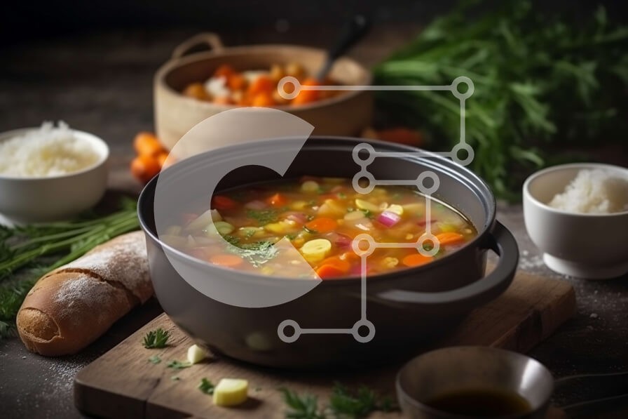 Υπάρχει δυνατότητα προσωποποίησης με δική σας φωτογραφία και προσαρμογής διαστάσεων κατόπιν παραγγελίας. Το συγεκεριμενο puzzle παρουσιαζει Αυτή η εικόνα παρουσιάζει μια κατσαρόλα με σούπα γεμάτη με διάφορα λαχανικά, όπως καρότα, σέλινο και πατάτες. Η σούπα τοποθετείται σε ένα ξύλινο τραπέζι δίπλα σε ένα καρβέλι ψωμί, το οποίο έχει κοπεί και τοποθετηθεί σε μια ξύλινη σανίδα. Η ρουστίκ ρύθμιση προσθέτει στη ζεστασι