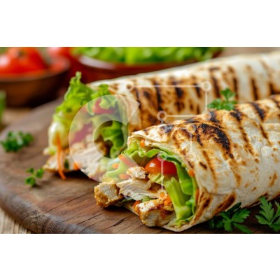 Υπάρχει δυνατότητα προσωποποίησης με δική σας φωτογραφία και προσαρμογής διαστάσεων κατόπιν παραγγελίας. Το συγεκεριμενο puzzle παρουσιαζει Αυτή η εικόνα παρουσιάζει δύο ψητά περιτυλίγματα γεμάτα με κοτόπουλο, μαρούλι, ντομάτες και καρότα, τακτοποιημένα σε μια ξύλινη σανίδα κοπής. Τα περιτυλίγματα έχουν ένα όμορφο χρυσοκαφέ μοτίβο σχάρας, υποδηλώνοντας ότι είναι φρεσκοπαρασκευασμένα. Ένα μπολ με φρέσκια σαλάτα είν