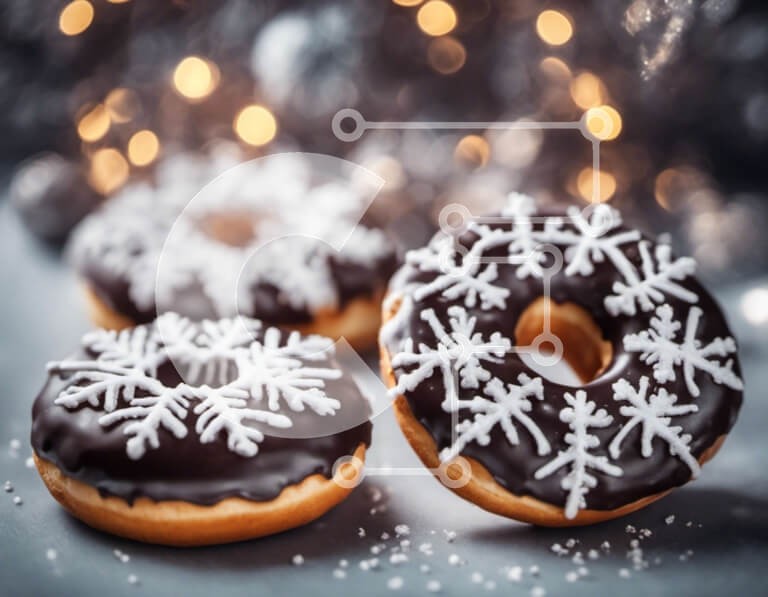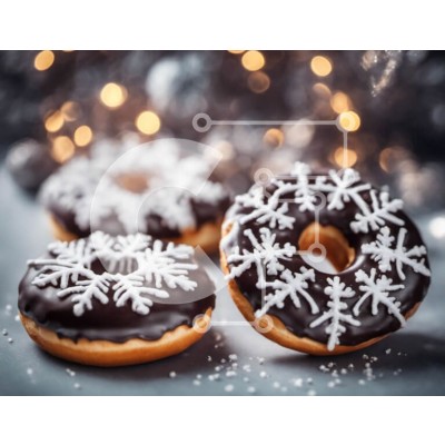 Υπάρχει δυνατότητα προσωποποίησης με δική σας φωτογραφία και προσαρμογής διαστάσεων κατόπιν παραγγελίας. Το συγεκεριμενο puzzle παρουσιαζει Αυτή η εικόνα παρουσιάζει τρία ντόνατς σοκολάτας με νιφάδες χιονιού να τα στολίζουν. Τοποθετούνται πάνω σε ένα γκρι φόντο, το οποίο είναι διακοσμημένο με πολύχρωμα φωτάκια και στολίδια. Υπάρχουν επίσης διάφορα κομμάτια καραμέλας διάσπαρτα στη σκηνή, συμπεριλαμβανομένων καραμέλ