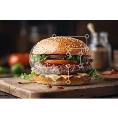 Υπάρχει δυνατότητα προσωποποίησης με δική σας φωτογραφία και προσαρμογής διαστάσεων κατόπιν παραγγελίας. Το συγεκεριμενο puzzle παρουσιαζει Αυτή η εικόνα παρουσιάζει ένα νόστιμο χάμπουργκερ με ένα ζουμερό μοσχαρίσιο μπιφτέκι, λιωμένο τυρί, μαρούλι, ντομάτα και κέτσαπ σε ένα μαλακό ψωμάκι. Το μπιφτέκι σερβίρεται σε ξύλινο ξύλο κοπής με μαχαίρι και πιρούνι στο πλάι. Ένα μοναδικό puzzle που συνδυάζει ποιότητα, αισθη