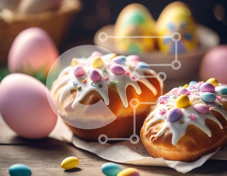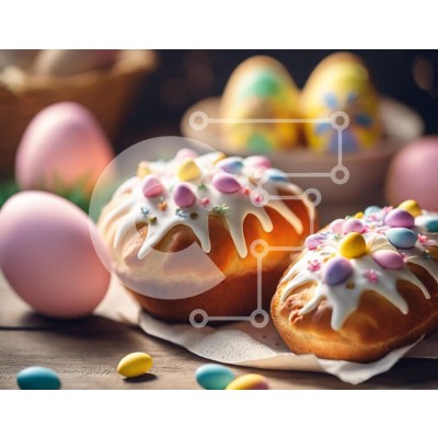 Υπάρχει δυνατότητα προσωποποίησης με δική σας φωτογραφία και προσαρμογής διαστάσεων κατόπιν παραγγελίας. Το συγεκεριμενο puzzle παρουσιαζει Αυτή η εικόνα απεικονίζει δύο γλυκά με θέμα το Πάσχα σε ένα ξύλινο τραπέζι, στολισμένο με πολύχρωμο γλάσο και αυγά, δημιουργώντας ένα εορταστικό και χαρούμενο σκηνικό. Πρόσθετα αντικείμενα όπως καλάθια, κύπελλα και χαρτοπετσέτες συμπληρώνουν το θέμα της γιορτής του Πάσχα. Ένα