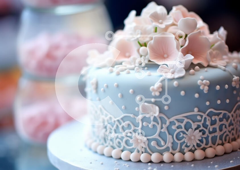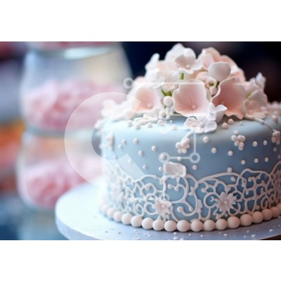 Υπάρχει δυνατότητα προσωποποίησης με δική σας φωτογραφία και προσαρμογής διαστάσεων κατόπιν παραγγελίας. Το συγεκεριμενο puzzle παρουσιαζει Αυτή η εικόνα παρουσιάζει ένα κομψά διακοσμημένο κέικ με ένα απαλό μπλε ζαχαρωτό κάλυμμα. Η τούρτα είναι διακοσμημένη με λεπτά λευκά βρώσιμα λουλούδια και μικρά μαργαριτάρια, δημιουργώντας ένα οπτικά εντυπωσιακό και περίπλοκο σχέδιο. Στο βάθος, υπάρχουν βάζα γεμάτα με ροζ καρα