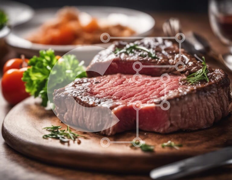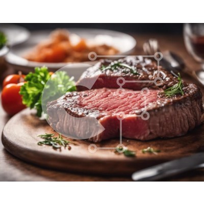 Υπάρχει δυνατότητα προσωποποίησης με δική σας φωτογραφία και προσαρμογής διαστάσεων κατόπιν παραγγελίας. Το συγεκεριμενο puzzle παρουσιαζει Αυτή η εικόνα δείχνει ένα κομμάτι μπριζόλα που έχει κοπεί σε φέτες και έχει τοποθετηθεί σε μια ξύλινη σανίδα κοπής. Συνοδεύεται από πιρούνια, μαχαίρια, και άλλα σκεύη, δηλώνοντας ότι είναι έτοιμο για σερβίρισμα. Στο τραπέζι δίπλα στο κρέας φαίνεται ένα μπουκάλι κρασί. Ένα μον
