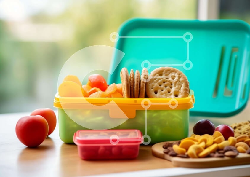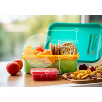 Υπάρχει δυνατότητα προσωποποίησης με δική σας φωτογραφία και προσαρμογής διαστάσεων κατόπιν παραγγελίας. Το συγεκεριμενο puzzle παρουσιαζει Η εικόνα δείχνει ένα κουτί μεσημεριανού γεύματος γεμάτο με μια ποικιλία από σνακ, όπως κράκερ, φρούτα και λαχανικά. Επιπλέον, υπάρχουν κομμάτια φρούτων, πιθανώς μήλα, σταφύλια ή πορτοκάλια, στο δοχείο. Ένα άδειο πλαστικό δοχείο είναι επίσης ορατό στο τραπέζι, υπονοώντας την πι