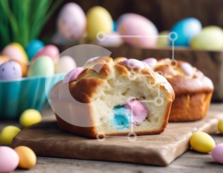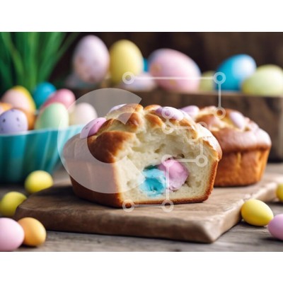 Υπάρχει δυνατότητα προσωποποίησης με δική σας φωτογραφία και προσαρμογής διαστάσεων κατόπιν παραγγελίας. Το συγεκεριμενο puzzle παρουσιαζει Αυτή η εικόνα παρουσιάζει ένα μάφιν με θέμα το Πάσχα με μια τρύπα στη μέση, που περιβάλλεται από πολύχρωμα αυγά και διάφορα είδη καραμέλας. Το μάφιν τοποθετείται σε δύο ξύλινες σανίδες κοπής, με μικρά μπολ γεμάτα με ζελέ, καραμέλες και marshmallows επίσης ορατά στο τραπέζι. Έ
