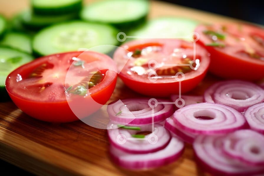 Υπάρχει δυνατότητα προσωποποίησης με δική σας φωτογραφία και προσαρμογής διαστάσεων κατόπιν παραγγελίας. Το συγεκεριμενο puzzle παρουσιαζει Η εικόνα παρουσιάζει φρεσκοκομμένα λαχανικά σε ξύλινο ξύλο κοπής. Οι φωτεινές κόκκινες ντομάτες μειώνονται στο μισό, αποκαλύπτοντας το ζουμερό εσωτερικό τους, ενώ τα μωβ κρεμμύδια σε λεπτές φέτες και οι στρογγυλοί πράσινοι αγγουριού δίνουν μια πολύχρωμη αντίθεση. Η σύνθεση είν