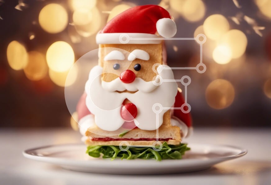 Υπάρχει δυνατότητα προσωποποίησης με δική σας φωτογραφία και προσαρμογής διαστάσεων κατόπιν παραγγελίας. Το συγεκεριμενο puzzle παρουσιαζει Αυτή η εικόνα παρουσιάζει ένα σάντουιτς με τον Άγιο Βασίλη να κάθεται από πάνω. Το σάντουιτς είναι όμορφα διακοσμημένο με κόκκινα και πράσινα χρώματα, υποδηλώνοντας τη χρήση φοντάν ή βρώσιμων υλικών. Γύρω από το σάντουιτς υπάρχουν στολίδια, φωτάκια και στολίδια, δημιουργώντας