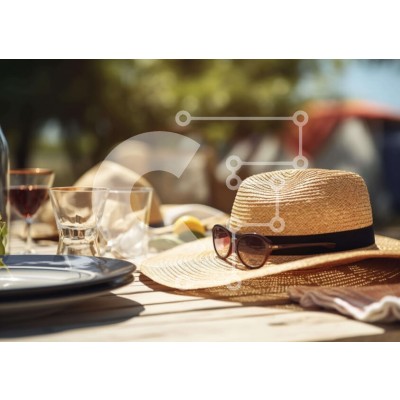 Υπάρχει δυνατότητα προσωποποίησης με δική σας φωτογραφία και προσαρμογής διαστάσεων κατόπιν παραγγελίας. Το συγεκεριμενο puzzle παρουσιαζει Η εικόνα παρουσιάζει ένα ψάθινο καπέλο, γυαλιά ηλίου, ποτήρια, πιάτα και σκεύη σε ένα τραπέζι εξωτερικού χώρου. Στο τραπέζι τοποθετείται επίσης ένα μπουκάλι κρασί, το οποίο θα μπορούσε να χρησιμοποιηθεί για να σερβίρετε ποτά ή σνακ. Επιπλέον, υπάρχουν πολλά μαχαιροπίρουνα, όπω
