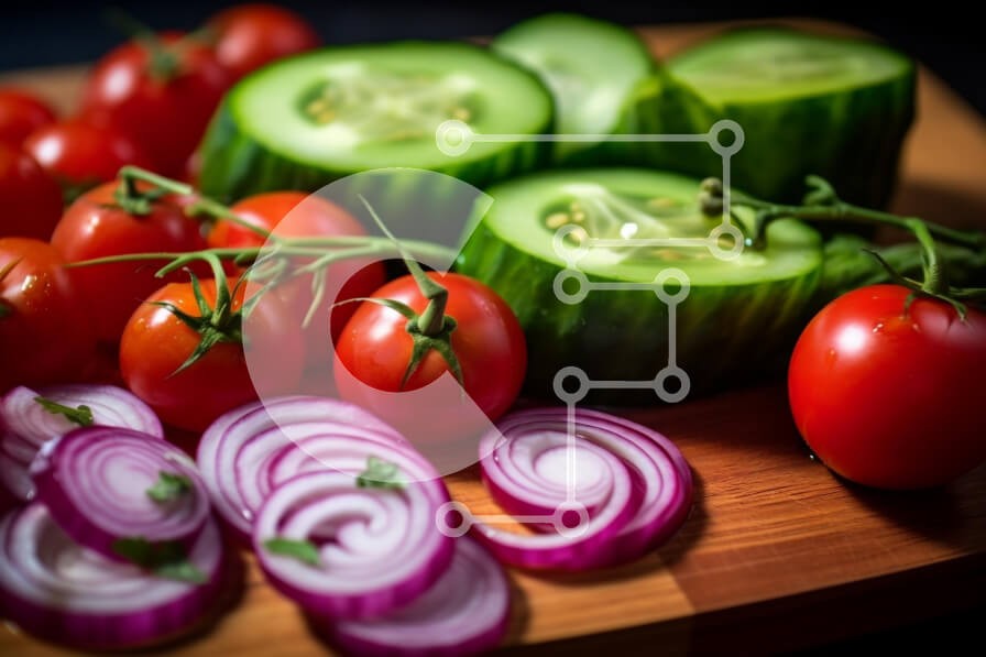 Υπάρχει δυνατότητα προσωποποίησης με δική σας φωτογραφία και προσαρμογής διαστάσεων κατόπιν παραγγελίας. Το συγεκεριμενο puzzle παρουσιαζει Αυτή η εικόνα παρουσιάζει μια ζωντανή διάταξη από φρέσκα λαχανικά σε μια ξύλινη σανίδα κοπής. Υπάρχουν πολλές κόκκινες ντομάτες, πράσινα αγγούρια και μωβ κρεμμύδια σε φέτες, όμορφα εμφανισμένα. Οι ντομάτες είναι στα κλήματα τους, ενώ τα αγγούρια κόβονται στη μέση για να αποκαλ
