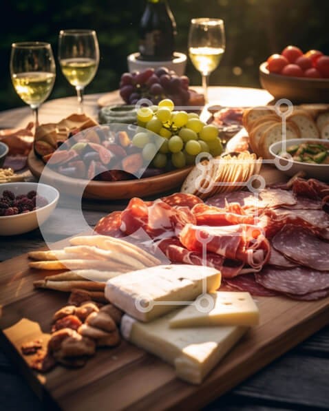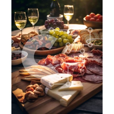 Υπάρχει δυνατότητα προσωποποίησης με δική σας φωτογραφία και προσαρμογής διαστάσεων κατόπιν παραγγελίας. Το συγεκεριμενο puzzle παρουσιαζει Η εικόνα δείχνει ένα ξύλινο τραπέζι με μια ποικιλία ειδών διατροφής όπως τυρί, κρέας, φρούτα και ξηρούς καρπούς. Υπάρχουν δύο ποτήρια κρασιού, που υποδηλώνουν ένα χαλαρό περιβάλλον για φαγητό σε εξωτερικούς χώρους. Ένα μοναδικό puzzle που συνδυάζει ποιότητα, αισθητική και εμπ