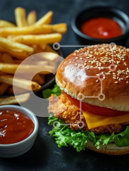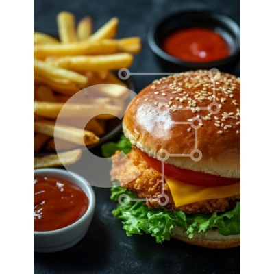 Υπάρχει δυνατότητα προσωποποίησης με δική σας φωτογραφία και προσαρμογής διαστάσεων κατόπιν παραγγελίας. Το συγεκεριμενο puzzle παρουσιαζει Η εικόνα παρουσιάζει ένα νόστιμο τηγανητό μπιφτέκι κοτόπουλου τοποθετημένο σε ένα ρουστίκ μαύρο τραπέζι. Το μπιφτέκι, γαρνιρισμένο με φρέσκο μαρούλι, μια φέτα ντομάτα και τυρί τσένταρ, ολοκληρώνεται με σουσάμι σε ένα χρυσό ψωμάκι. Μια πλευρά από τραγανές τηγανιτές πατάτες σε