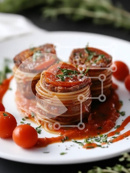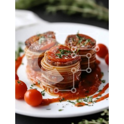 Υπάρχει δυνατότητα προσωποποίησης με δική σας φωτογραφία και προσαρμογής διαστάσεων κατόπιν παραγγελίας. Το συγεκεριμενο puzzle παρουσιαζει Το πιάτο περιλαμβάνει μια δημιουργική παρουσίαση από μακαρόνια τυλιγμένα σε κρέας, με σάλτσα ντομάτας και γαρνιρισμένα με βότανα. Το πιάτο είναι διακοσμημένο με μια ζωντανή κόκκινη σάλτσα και μικρά ντοματίνια, ενισχύοντας την οπτική γοητεία του γεύματος. Η σκηνή τοποθετείται σ