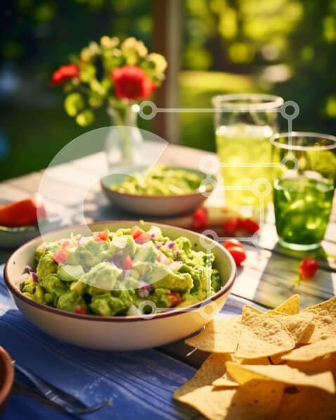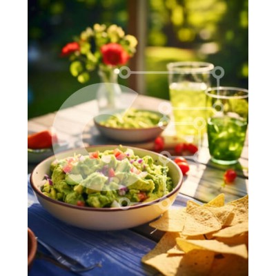 Υπάρχει δυνατότητα προσωποποίησης με δική σας φωτογραφία και προσαρμογής διαστάσεων κατόπιν παραγγελίας. Το συγεκεριμενο puzzle παρουσιαζει Η εικόνα παρουσιάζει μια υπαίθρια σκηνή φαγητού με μπολ με γκουακαμόλε, πατατάκια και σάλσα σε ένα τραπέζι. Ποτήρια πράσινο ή κόκκινο κρασί προσθέτουν στην παρουσίαση του γεύματος, μαζί με φλιτζάνια νερό και ένα δροσιστικό ρόφημα όπως τσάι ή λεμονάδα. Ένα μοναδικό puzzle που