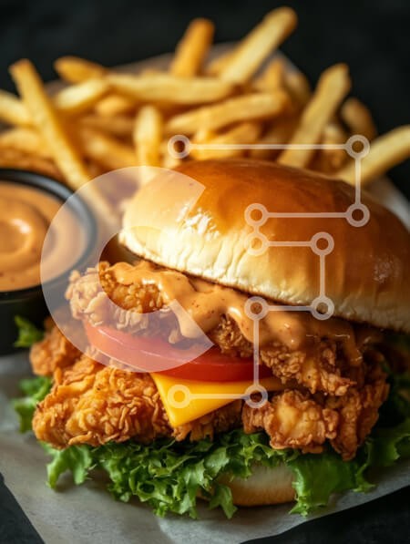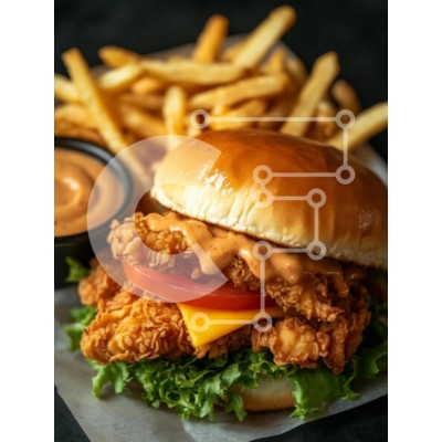 Υπάρχει δυνατότητα προσωποποίησης με δική σας φωτογραφία και προσαρμογής διαστάσεων κατόπιν παραγγελίας. Το συγεκεριμενο puzzle παρουσιαζει Αυτή η εικόνα παρουσιάζει ένα υπέροχο σάντουιτς κοτόπουλου που σερβίρεται με τραγανές τηγανιτές πατάτες. Το σάντουιτς αποτελείται από ένα φρυγανισμένο ψωμάκι γεμάτο με τραγανό τηγανητό κοτόπουλο, φρέσκο μαρούλι, μια φέτα ντομάτα και λιωμένο τυρί, με μια κρεμώδη σάλτσα. Οι πα