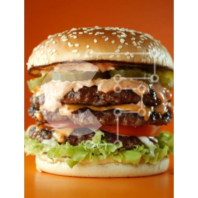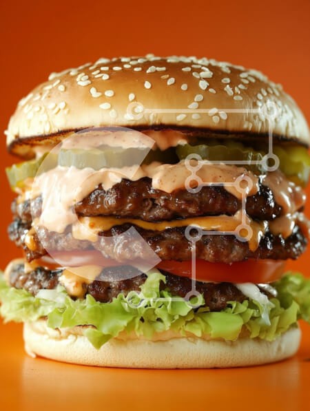Υπάρχει δυνατότητα προσωποποίησης με δική σας φωτογραφία και προσαρμογής διαστάσεων κατόπιν παραγγελίας. Το συγεκεριμενο puzzle παρουσιαζει Αυτή η εικόνα παρουσιάζει ένα μεγάλο, ορεκτικό χάμπουργκερ στοιβαγμένο ψηλά με τρία ζουμερά μοσχαρίσια μπιφτέκια, φρέσκο μαρούλι, φέτες ντομάτας, τουρσιά και μια κρεμώδη σάλτσα, όλα φωλιασμένα ανάμεσα σε φρυγανισμένα ψωμάκια σουσαμιού. Το ζωντανό πορτοκαλί σκηνικό ενισχύει τ