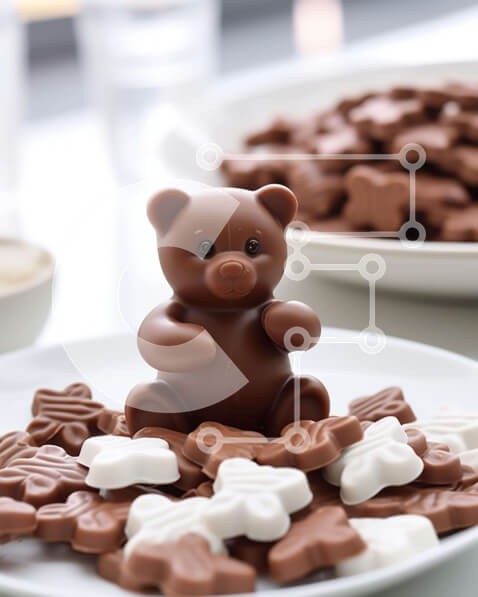 Υπάρχει δυνατότητα προσωποποίησης με δική σας φωτογραφία και προσαρμογής διαστάσεων κατόπιν παραγγελίας. Το συγεκεριμενο puzzle παρουσιαζει Η εικόνα παρουσιάζει ένα λευκό πιάτο με πολλά αρκουδάκια σοκολάτας τοποθετημένα πάνω του. Γύρω από το πιάτο είναι διάσπαρτα και μικρά κομμάτια καραμέλας, τα οποία μπορεί να σχετίζονται με το θέμα του γλυκού. Ένα φλιτζάνι υπάρχει επίσης στην εικόνα, που πιθανότατα χρησιμοποιείτ