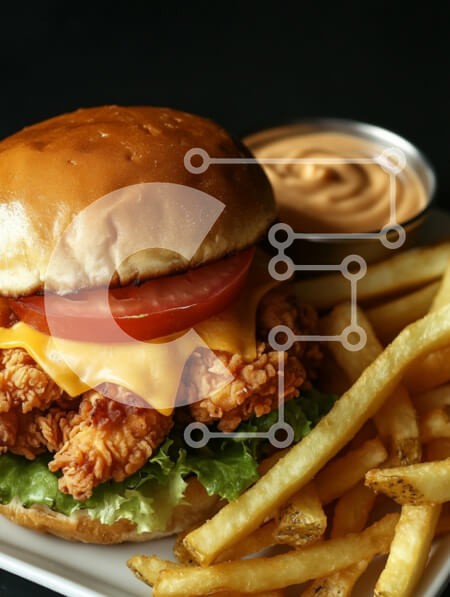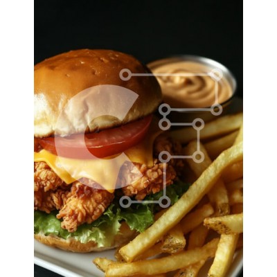 Υπάρχει δυνατότητα προσωποποίησης με δική σας φωτογραφία και προσαρμογής διαστάσεων κατόπιν παραγγελίας. Το συγεκεριμενο puzzle παρουσιαζει Η εικόνα δείχνει ένα νόστιμο σάντουιτς κοτόπουλου με τραγανό τηγανητό κοτόπουλο, λιωμένο τυρί τσένταρ και φρέσκες φέτες ντομάτας, όλα φωλιασμένα σε ένα μαλακό ψωμάκι. Συνοδεύουμε το σάντουιτς χρυσαφένιες πατάτες και ένα μικρό μπολ με σάλτσα, σε σκούρο φόντο που κάνει το φαγητό