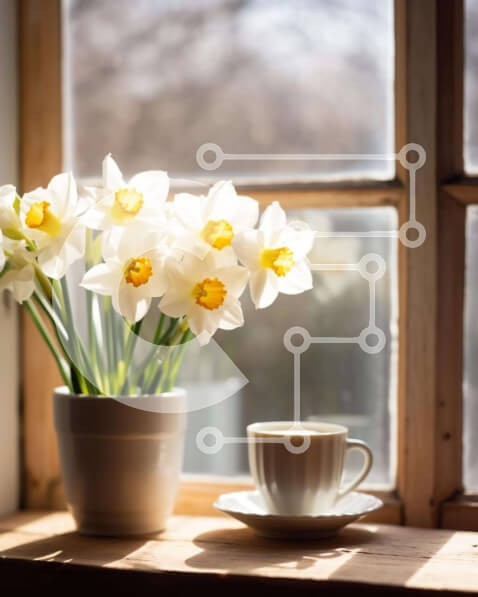 Υπάρχει δυνατότητα προσωποποίησης με δική σας φωτογραφία και προσαρμογής διαστάσεων κατόπιν παραγγελίας. Το συγεκεριμενο puzzle παρουσιαζει Αυτή η εικόνα παρουσιάζει ένα φλιτζάνι καφέ που κάθεται στο περβάζι του παραθύρου, δίπλα σε μερικά λευκά άνθη ασφόδελου. Υπάρχουν επίσης αρκετές μικρές γλάστρες με λουλούδια στο βάθος, υποδηλώνοντας την παρουσία πολλών τύπων λουλουδιών. Η σκηνή μπορεί να περιλαμβάνει μια σύνθε