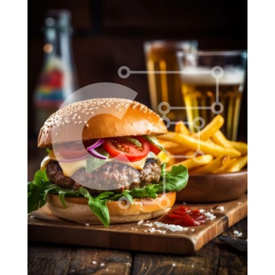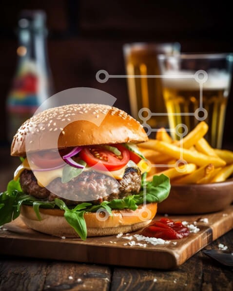 Υπάρχει δυνατότητα προσωποποίησης με δική σας φωτογραφία και προσαρμογής διαστάσεων κατόπιν παραγγελίας. Το συγεκεριμενο puzzle παρουσιαζει Αυτή η εικόνα είναι ένα χάμπουργκερ με μαρούλι, ντομάτα και τηγανιτές πατάτες σε ξύλινη σανίδα με μπύρα στο φόντο. Είναι μια κοντινή λήψη του φαγητού, με ορατά το μπιφτέκι και τις επικαλύψεις. Η ξύλινη σανίδα προσθέτει μια ρουστίκ πινελιά στην εικόνα, ενώ η μπύρα στο βάθος προ
