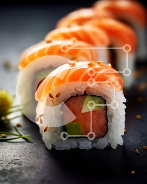 Υπάρχει δυνατότητα προσωποποίησης με δική σας φωτογραφία και προσαρμογής διαστάσεων κατόπιν παραγγελίας. Το συγεκεριμενο puzzle παρουσιαζει Αυτή η εικόνα παρουσιάζει ρολά σούσι με φρέσκο σολομό, κρεμώδες αβοκάντο και πασπαλισμένο με σουσάμι σε σκούρο φόντο. Τα ρολά είναι τακτοποιημένα και τονίζονται από το αντίθετο σκηνικό, δημιουργώντας μια εντυπωσιακή εικόνα που αποτυπώνει τέλεια την ομορφιά αυτού του παραδοσι
