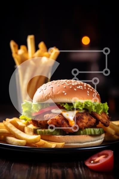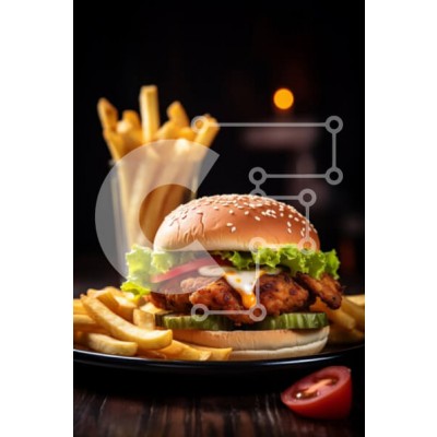 Υπάρχει δυνατότητα προσωποποίησης με δική σας φωτογραφία και προσαρμογής διαστάσεων κατόπιν παραγγελίας. Το συγεκεριμενο puzzle παρουσιαζει Αυτή η εικόνα παρουσιάζει ένα νόστιμο μπιφτέκι κοτόπουλου γαρνιρισμένο με φρέσκο μαρούλι, ντομάτα και μαγιονέζα. Σερβίρεται δίπλα σε μια γενναιόδωρη μερίδα τραγανές πατάτες σε σκούρο πιάτο, δημιουργώντας μια ορεκτική αντίθεση στο θολό φόντο. Το μπιφτέκι παρουσιάζει ένα κουλο