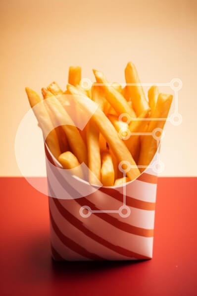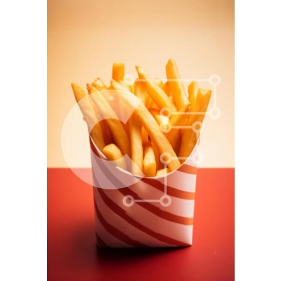 Υπάρχει δυνατότητα προσωποποίησης με δική σας φωτογραφία και προσαρμογής διαστάσεων κατόπιν παραγγελίας. Το συγεκεριμενο puzzle παρουσιαζει Ένα δοχείο γεμάτο με χρυσές, τραγανές τηγανιτές πατάτες στέκεται σε μια ζωντανή κόκκινη επιφάνεια. Οι πατάτες είναι τοποθετημένες όρθιες σε ένα χάρτινο κουτί με κόκκινες και άσπρες ρίγες, σε ένα απαλό ντεγκραντέ φόντο που μεταβαίνει από ανοιχτό κίτρινο σε ζεστό μπεζ. Η εικόνα