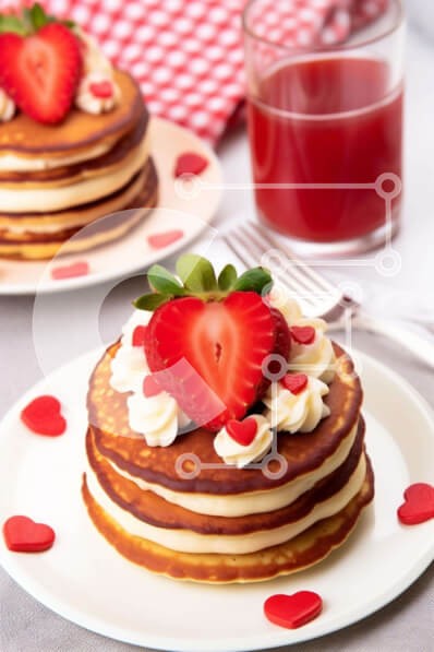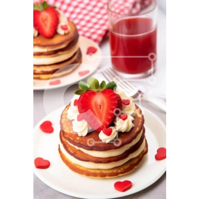 Υπάρχει δυνατότητα προσωποποίησης με δική σας φωτογραφία και προσαρμογής διαστάσεων κατόπιν παραγγελίας. Το συγεκεριμενο puzzle παρουσιαζει Η εικόνα παρουσιάζει δύο στοίβες τηγανίτες σε λευκά πιάτα, καθεμία στολισμένη με φρέσκες φράουλες και μια γενναιόδωρη κούκλα σαντιγί. Ένα ποτήρι χυμό με γεύση φράουλα συμπληρώνει την εικόνα, δημιουργώντας ένα ιδανικό σκηνικό για τον εορτασμό της Ημέρας του Αγίου Βαλεντίνου ή ο