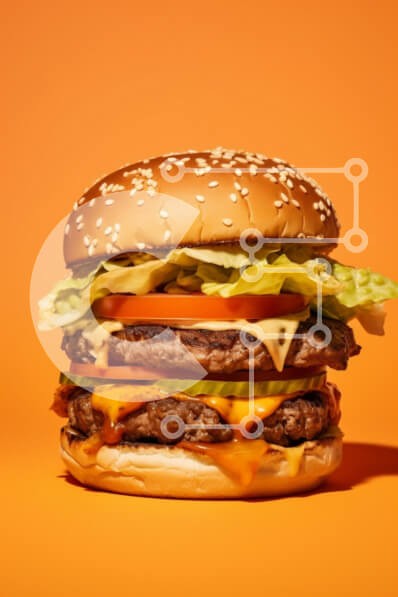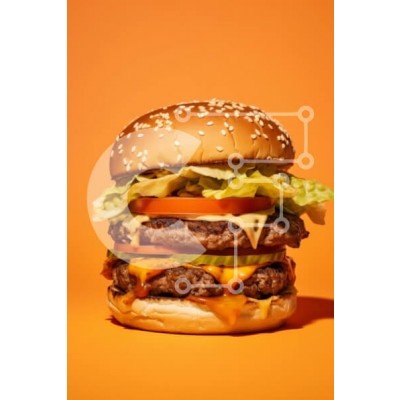 Υπάρχει δυνατότητα προσωποποίησης με δική σας φωτογραφία και προσαρμογής διαστάσεων κατόπιν παραγγελίας. Το συγεκεριμενο puzzle παρουσιαζει Αυτή η εικόνα παρουσιάζει ένα πανύψηλο χάμπουργκερ τοποθετημένο σε ένα ζωντανό πορτοκαλί φόντο. Το μπιφτέκι περιλαμβάνει ένα τσουρέκι με σουσάμι με φρέσκο μαρούλι, ντομάτες και στρώσεις λιωμένου τυριού και δύο ζουμερά μοσχαρίσια μπιφτέκια. Τα πλούσια χρώματα των συστατικών δ