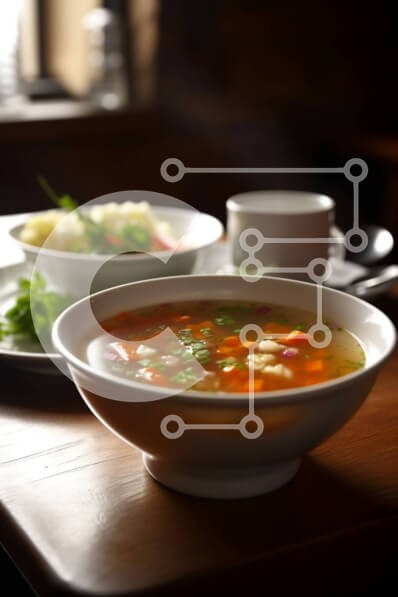 Υπάρχει δυνατότητα προσωποποίησης με δική σας φωτογραφία και προσαρμογής διαστάσεων κατόπιν παραγγελίας. Το συγεκεριμενο puzzle παρουσιαζει Αυτή η εικόνα παρουσιάζει ένα μπολ σούπας με φρέσκα λαχανικά και ζυμαρικά. Ο ζωμός είναι ζεστός στον ατμό και τα λαχανικά είναι πολύχρωμα και ζωντανά, προσθέτοντας γεύση και θρεπτική αξία. Είναι το τέλειο γεύμα για μια ζεστή νύχτα ή όταν αισθάνεστε κάτω από τον καιρό. Ένα μον