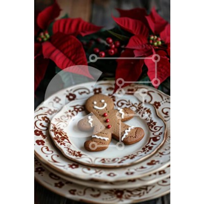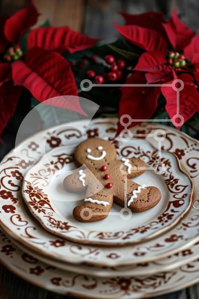 Υπάρχει δυνατότητα προσωποποίησης με δική σας φωτογραφία και προσαρμογής διαστάσεων κατόπιν παραγγελίας. Το συγεκεριμενο puzzle παρουσιαζει Η εικόνα παρουσιάζει ένα μπισκότο με μελόψωμο σε σχήμα ανθρώπου, στολισμένο με γλάσο και διακοσμητικά καραμέλας. Τοποθετείται σε ένα πιάτο με όμορφα σχέδια, με επιπλέον πιάτα στοιβαγμένα από κάτω. Το φόντο περιλαμβάνει ζωηρά κόκκινα λουλούδια poinsettia, που συμβάλλουν σε μια