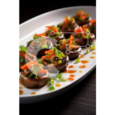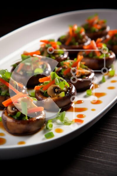 Υπάρχει δυνατότητα προσωποποίησης με δική σας φωτογραφία και προσαρμογής διαστάσεων κατόπιν παραγγελίας. Το συγεκεριμενο puzzle παρουσιαζει Αυτή η εικόνα παρουσιάζει μια όμορφα τοποθετημένη πιατέλα με γεμιστά μανιτάρια, γαρνιρισμένη με ζωηρές φέτες καρότου και φρέσκα μυρωδικά. Τα μανιτάρια γυαλίζουν με μια αλμυρή σάλτσα, δημιουργώντας μια ορεκτική παρουσίαση. Το φόντο είναι σκούρο, ενισχύοντας τα χρώματα του πιάτο