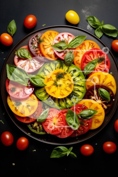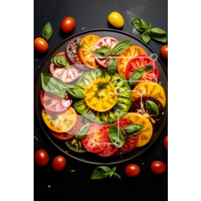 Υπάρχει δυνατότητα προσωποποίησης με δική σας φωτογραφία και προσαρμογής διαστάσεων κατόπιν παραγγελίας. Το συγεκεριμενο puzzle παρουσιαζει Η εικόνα δείχνει μια πολύχρωμη σαλάτα ντομάτας και βασιλικού σε ένα μαύρο πιάτο. Η σαλάτα περιλαμβάνει ντομάτες σε φέτες σε διάφορα χρώματα όπως κόκκινο, κίτρινο, πορτοκαλί, πράσινο, μωβ, ροζ και λευκό. Υπάρχουν και άλλα λαχανικά, δημιουργώντας μια οπτικά ελκυστική σύνθεση. Έ