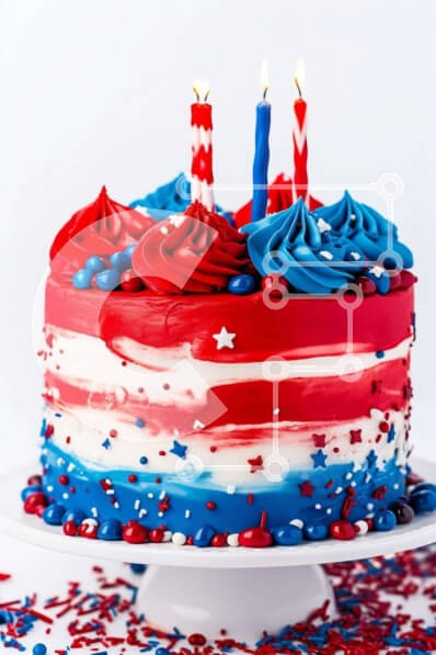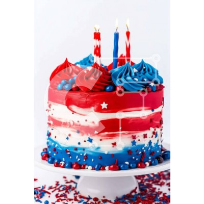 Υπάρχει δυνατότητα προσωποποίησης με δική σας φωτογραφία και προσαρμογής διαστάσεων κατόπιν παραγγελίας. Το συγεκεριμενο puzzle παρουσιαζει Αυτή η εικόνα παρουσιάζει ένα κόκκινο, λευκό και μπλε διακοσμημένο κέικ με τρία αναμμένα κεριά στην κορυφή. Το κέικ παρουσιάζεται σε ένα πιάτο σε σχήμα οβάλ, που περιβάλλεται από πολύχρωμα ψεκάσματα, προσθέτοντας μια εορταστική πινελιά στο γλυκό. Ένα μοναδικό puzzle που συνδυ