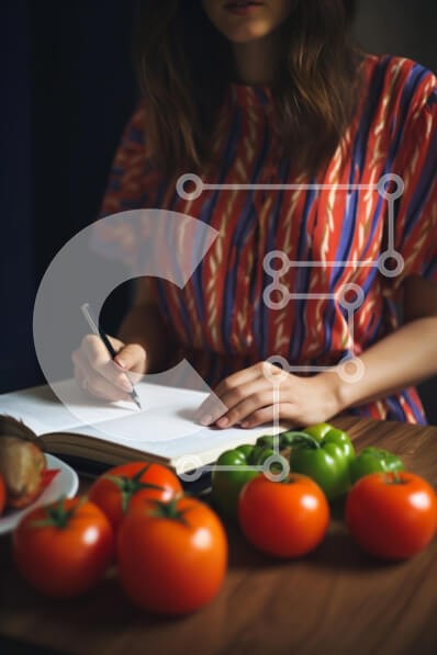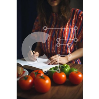 Υπάρχει δυνατότητα προσωποποίησης με δική σας φωτογραφία και προσαρμογής διαστάσεων κατόπιν παραγγελίας. Το συγεκεριμενο puzzle παρουσιαζει Η εικόνα απεικονίζει μια γυναίκα που γράφει σε ένα ανοιχτό σημειωματάριο που περιβάλλεται από φρέσκα λαχανικά και φρούτα σε ένα τραπέζι. Διάφορα είδη φρούτων και λαχανικών όπως ντομάτες, καρότα, μήλα, πορτοκάλια, μπανάνες, μαζί με μπολ με ζυμαρικά, ρύζι, ψωμί, πατάτες, μαρούλι