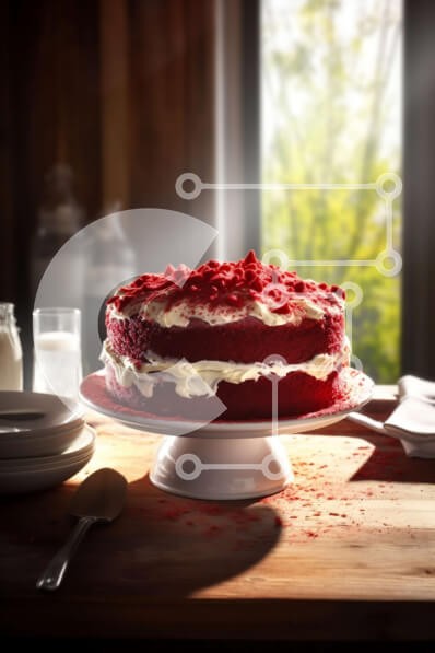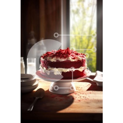 Υπάρχει δυνατότητα προσωποποίησης με δική σας φωτογραφία και προσαρμογής διαστάσεων κατόπιν παραγγελίας. Το συγεκεριμενο puzzle παρουσιαζει Αυτή η εικόνα παρουσιάζει ένα κόκκινο βελούδινο κέικ σε ένα λευκό πιάτο με κρέμα τυριού, με κόκκινα μούρα. Η τούρτα εκτίθεται σε ένα ξύλινο τραπέζι μπροστά από ένα παράθυρο με εκπληκτική θέα σε ένα δάσος. Δύο ποτήρια νερό υπάρχουν επίσης στο τραπέζι. Ένα μοναδικό puzzle που σ