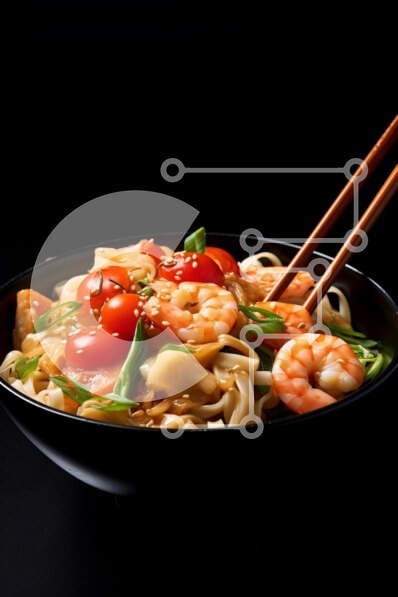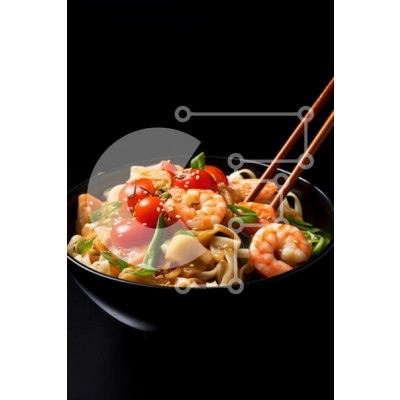 Υπάρχει δυνατότητα προσωποποίησης με δική σας φωτογραφία και προσαρμογής διαστάσεων κατόπιν παραγγελίας. Το συγεκεριμενο puzzle παρουσιαζει Αυτή η εικόνα παρουσιάζει ένα μπολ με νουντλς γαρίδας, όμορφα διατεταγμένα με ζωντανά ντοματίνια, πράσινα κρεμμύδια και σουσάμι διάσπαρτα από πάνω. Το σκηνικό είναι ένα κομψό μαύρο, ενισχύοντας τα πλούσια χρώματα του πιάτου. Δύο ξύλινα ξυλάκια είναι τοποθετημένα πάνω από το μπ