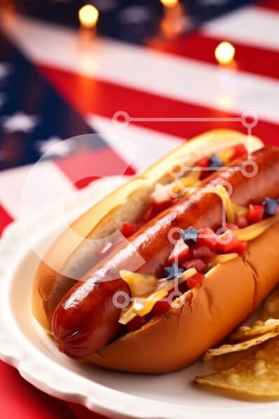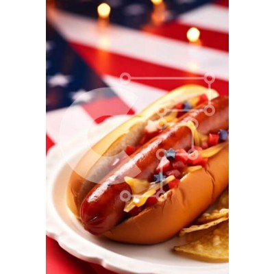 Υπάρχει δυνατότητα προσωποποίησης με δική σας φωτογραφία και προσαρμογής διαστάσεων κατόπιν παραγγελίας. Το συγεκεριμενο puzzle παρουσιαζει Η εικόνα παρουσιάζει ένα τσουρέκι για χοτ-ντογκ με διάφορες επικαλύψεις και καρυκεύματα, καθώς και πατατάκια και σάλσα. Το πιάτο είναι τοποθετημένο μπροστά από ένα φόντο αμερικανικής σημαίας, υποδηλώνοντας ότι το φαγητό σερβίρεται κατά τη διάρκεια των εορτασμών της Ημέρας της