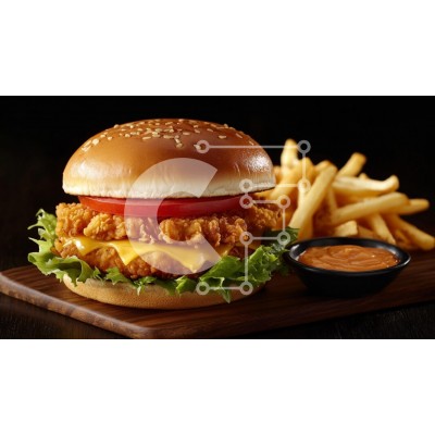 Υπάρχει δυνατότητα προσωποποίησης με δική σας φωτογραφία και προσαρμογής διαστάσεων κατόπιν παραγγελίας. Το συγεκεριμενο puzzle παρουσιαζει Αυτή η εικόνα παρουσιάζει ένα νόστιμο μπιφτέκι με ένα κουλούρι σουσαμιού, τραγανό τηγανητό κοτόπουλο, λιωμένο τυρί, μαρούλι και μια φέτα ντομάτα. Δίπλα στο μπιφτέκι, υπάρχουν χρυσές τηγανιτές πατάτες και ένα μικρό μπολ με σάλτσα. Το μπιφτέκι παρουσιάζεται σε ξύλινη πιατέλα σε